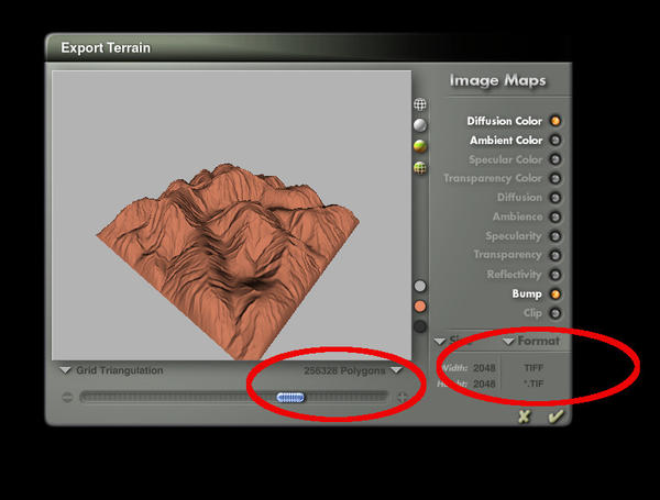 The first pic is of a terrain made and rendered in Bryce. I then exported the .obj, using the settings in the second pic. Note the high settings used for the terrain 256K polys - this I find necessary to get any reasonable definition. I use .tif to try to get the same texture into Carrara.
