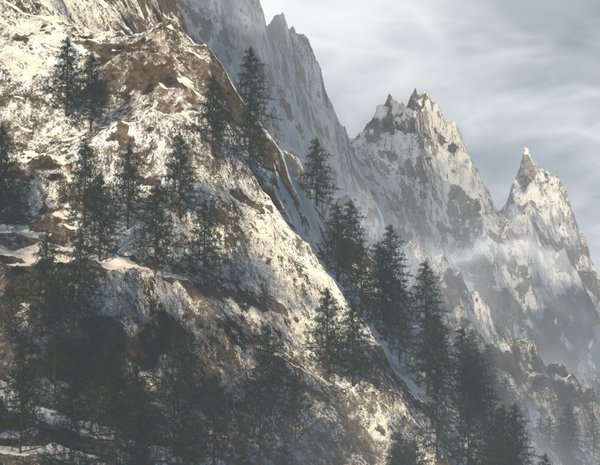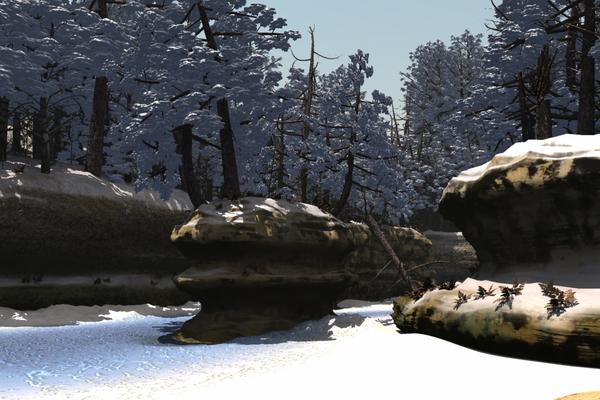the snow on the ground is purely procedural terrain shaders. I want to augment it with modeled snow drifts/piles to better match the trees, but I need a base to start.