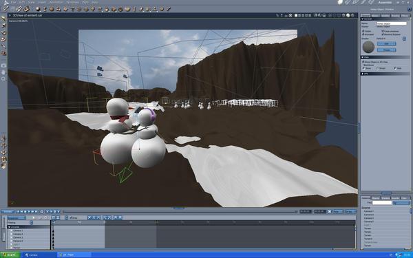 I adjusted most of the textures, added a level of smoothing to the lorez characters closest to the the camera, changed the poses, added a few last details and aimed a couple low intensity cameras set to negative into the scene from the left (the water and characters were getting some mysterious light scatter from that side that shouldn't have been there). I also lowered the density on the volumetric cloud and moved it down and a little to the left. Lastly I took out one of the snow planes and replaced it with a 10x10x10 replicator of grey sphere primitives to make snow right in front of the camera.