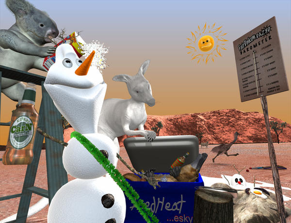 Love all the animals in there! This image is so much fun already. Such delicious hilarious details. The platypus looks like he's enjoying himself the most. :-) Poor snowman... :( That sun looks really angry.