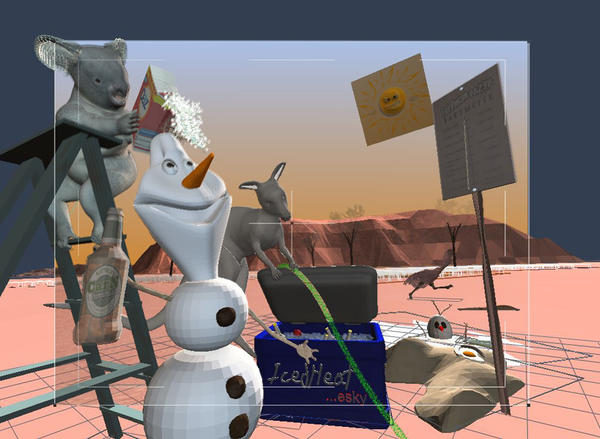 made some tinsel, a melted snowman a washing powder box with flakes which still need texturing.. also used emoji fella with a textured plane to represent the sun...