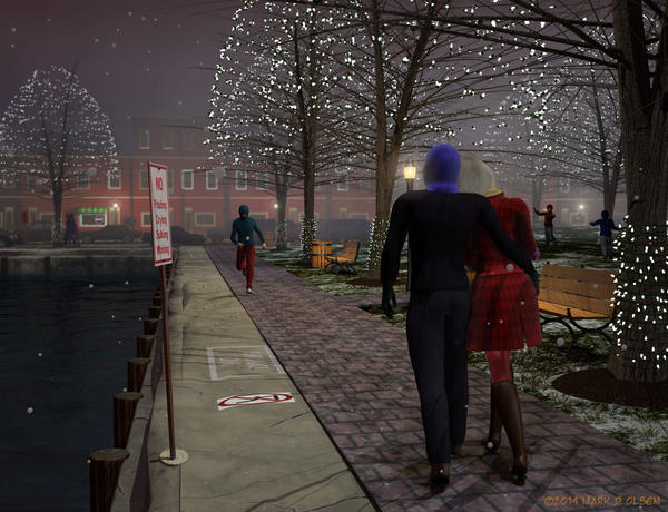 Postwork: de-saturated the whole image slightly, fixed some lighting issues caused by my textures, fixed a little bit of poke-through on the woman's hair, used the depth pass to add some lens blur, darkened the edges and added signature.