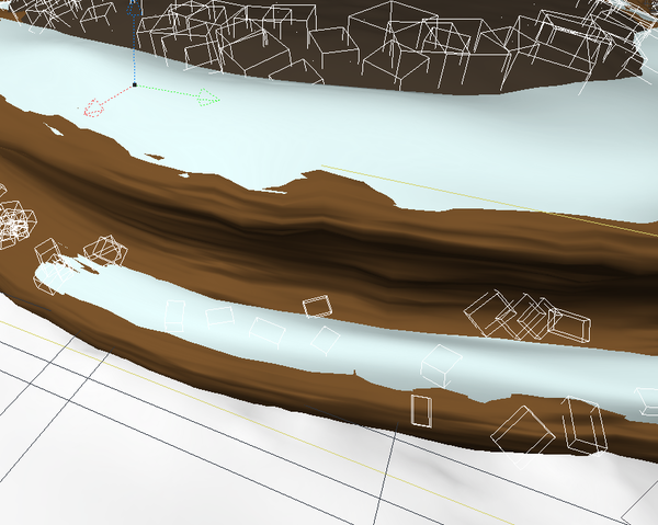 I built the rock outcrops as vertex objects, so what I did was to select polygons in the flatish areas where I wanted deep snow, and copied and then pasted. This created a separate polymesh. The displacement painting that I had done on the outcrop was eliminated from the pasted polymesh, which was good for my purposes. I then used soft select to manipulate the mesh to bulge it up or push it in to hide the edges.