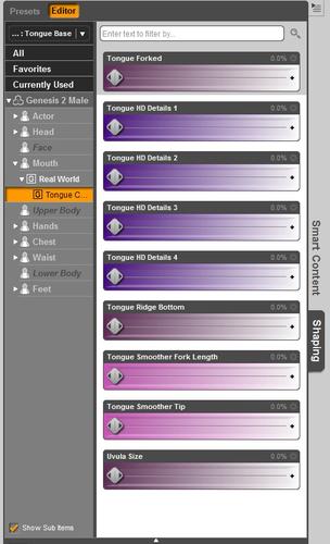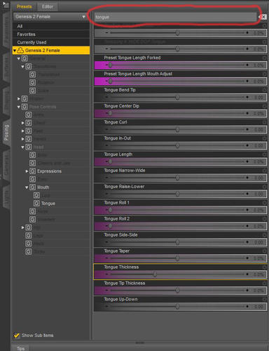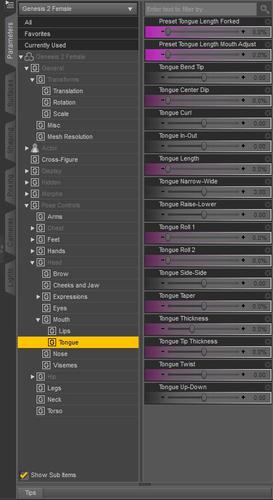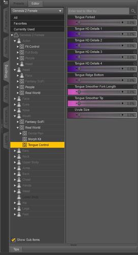 I just bought the tongue controls for Poser, but looking through the tutorial.pdf, it doesn't say where to look for it, just Daz Studio. All I see in my pose folders (doing a search) is 4 Zero morphs for Genesis 2 Female, and 4 for Male. I've tried looking from the tree down in the G2 body selection, head selection, tongue selection, I can't find any of the morphs to change the tongue that didn't come with stock G2.