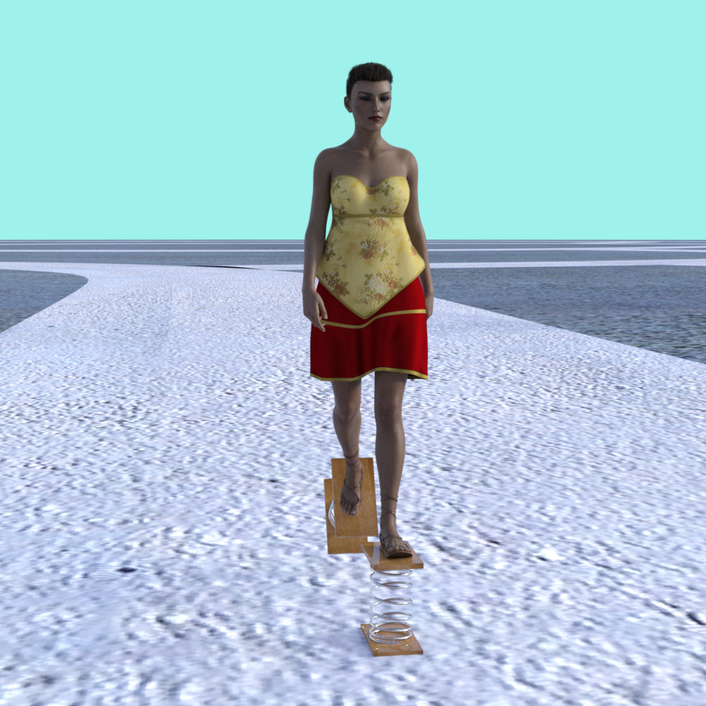 Don't know what to call this other than a 'Spring Thing'. It's a mad idea that came to me and may be useful if you have a similar mad idea. It's a prop consisting of two boards with a spring between. I added three quick and dirty morphs to compress the spring and bend it relative to the bottom board. The morphs should probably be restricted to 400% or less. For an idea how to use the spring thing, take a look here: https://www.daz3d.com/forums/discussion/comment/6671831/#Comment_6671831