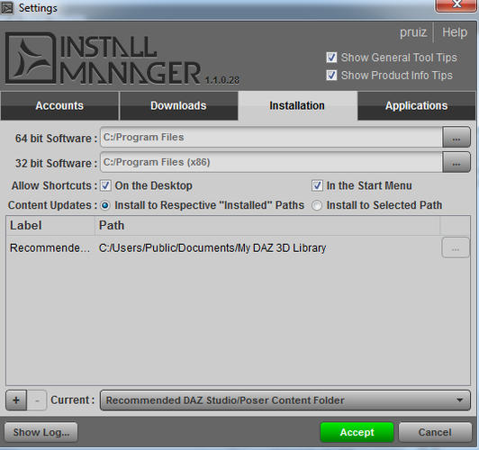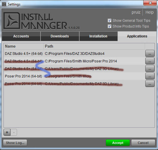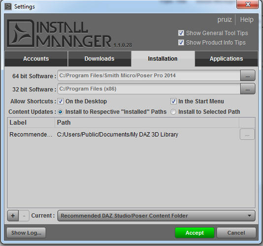 Richard - I followed or think I followed your instructions and OK I am now getting some files in poser and DS but not others? Attached are screen shots of my Installation and settings screens in Install manager. I don't know at this point which end is up. Any problems you see in the paths and settings? Thanks for your help.