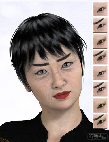 She features a beautifully aged skin, with 4 dialed ethnic head morphs. Included are four makeup options with and without enhanced eyebrows, as well as four lipstick options.