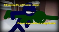 Global Offensive-trailer, introducing the Anti-Hacker weapon -> fires an angry admin at a target hacker.