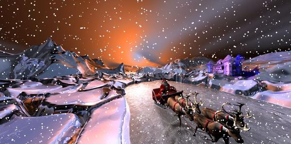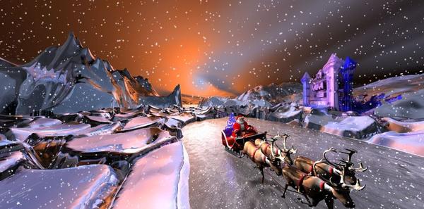 I do like the addition of the snow to the image. The composition is very interesting and the touch of red is a nice control. I think that if I were working on this image I would scale up the building just a bit more. I would do this because as it stands now there is not enough real estate between where Santa is and the castle. So the castle seems to be too small to my eye. After doing that then the mountain on the left may have to be a bit bigger to counter weight the building. I would also introduce that pretty purple/blue color of the building in at least one more place. Maybe a present in Santa's bag and then some where in the canyons to the left of Santa. I would do this so that my eye would not be pulled to the building. If I did not like that then I would consider changing the color of the building to more the orange that is in the sky. Either way I would want my viewer to see Santa and his sleigh and reindeer and keep them as their focus. I might add a spot light on Santa as well. Don't know if that will work but I would try it and see. Might be cool to see if a three spot rig could give me some additional rim light on him.