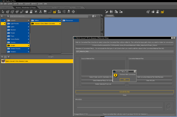 1. When converting some skins the texture folder can not be found so DAZ requests the user to locate the required file manually. Then the script processes the conversion for that area of the model. When it starts the next area I have to point the script to the same/right folder in some cases 20 to 80 times! Is there a work around to this? I understand that the file folder structure for various skins may vary but in most cases pointing it once or three times would be acceptable, it just slows down the process.