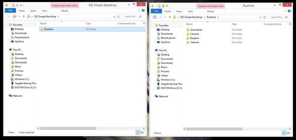When I click on the file folder PJZ SIMPLE BACKDROP[{image below]}(which has a zipper on it but doesn't seem to actually be compressed) there is immediately a file folder called runtime and inside that are folders named: Geometries/ Libraries/Read Me/Textures. . . .these appear to be the similar to the MEC4D textures I just bought (thanks for the info), although the MEC4D don't contain Geometries or Read Me. . .