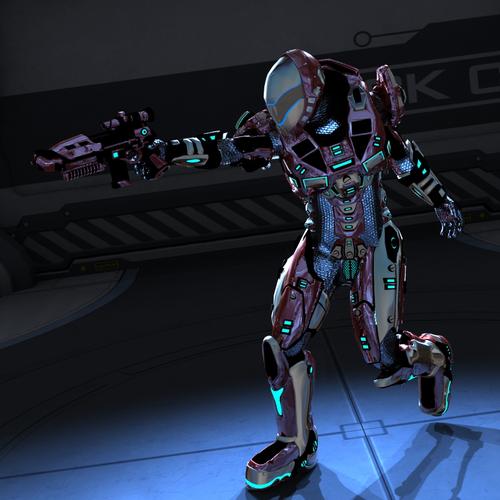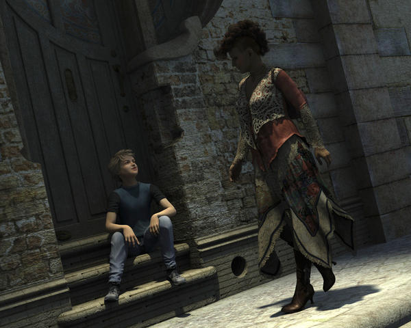 Here is one I was working on when my electricity went out last night, and it wasn't saved. It needs light from the doorway to make it believable but looks very promising. I turned off the specular lights and the 6, 4 and 8 o'clock ones. This has a UE light with a map and and overhead AoA Spotlight. I did a second render with just the rim lights on the walking figure only and added the layer in Photoshop. So the second render shows it without the rim lights.