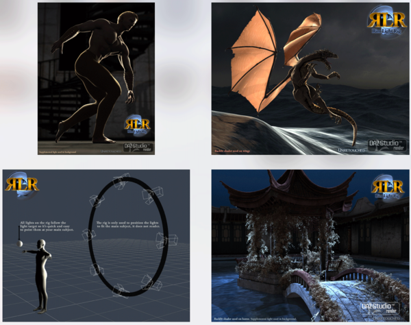 Rim Light Rig is a combination prop and multiple light set for figures and props. The dramatic effect is a halo outline and silhouette that separates prop/figure from background adding dimension to your scene. The spotlights are parented to a non-rendering torus for easy positioning and scaling to fit your main subject. All of the spotlights follow a light target for the ability draw attention where you want it.