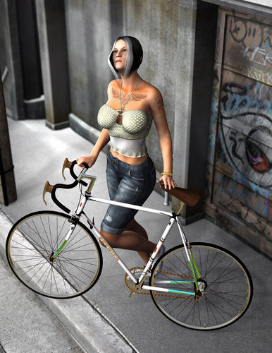 Anyway, it needs to be adjusted a bit. I think stronger shadows would be better to, eh? What I do like is the fact that there is graffiti on the wall and tattoos on her. I like that concept of the illustrated woman in the illustrated city, etc. I could play with some bolder art for the tattoos. That would be fun!