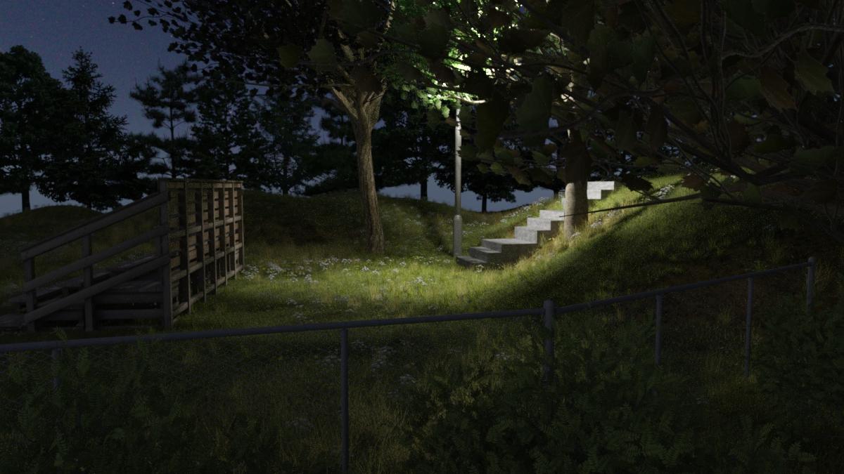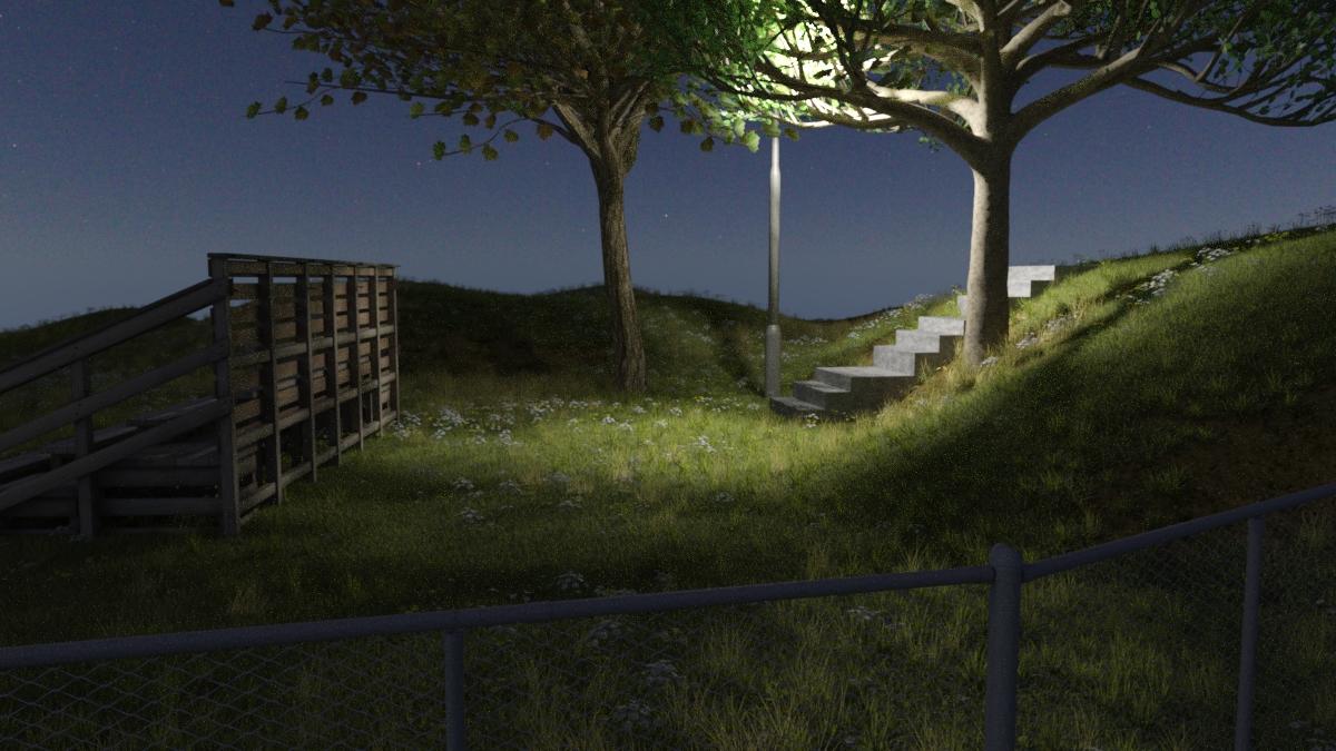 A scene from memory. I was out walking the dog at the park and the evening light shown down from under the trees casting a light on only a spot pf the grass below.