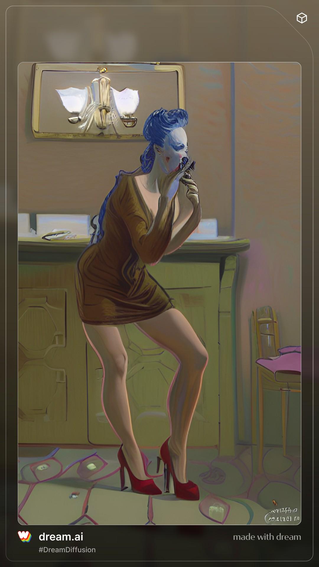 Prompt: woman in high heels standing in hall and fixing her makeup in a hand mirror for her date