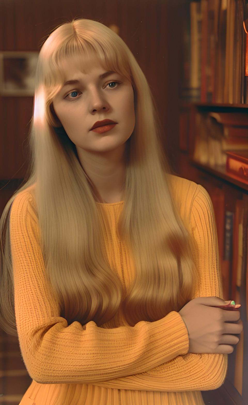 "Woman, long blonde hair, 30 year old, looks like Margarita Terekhova, in the style of Tarkovsky, 1960s retro"