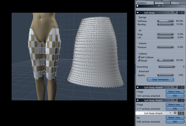Great discussion. I am still reloading programs and content, but I did get a chance to do one test of a skirt using Aiko3. I think there is a lot of potential, even though my soft-body attached part didn't quite work the way I intended. I only did the one test, but I think more experimenting will discover situations in which this will work very well (I anticipate continued problems with things like furniture, but one problem at a time). This method focuses on two soft body physics functions that seem to work pretty well, and ignores one that doesn't.