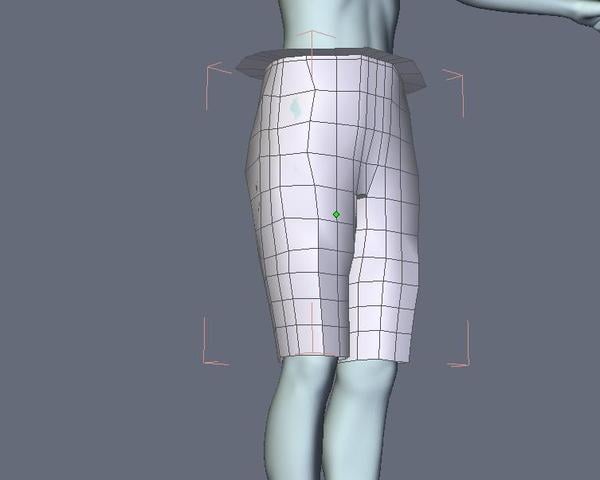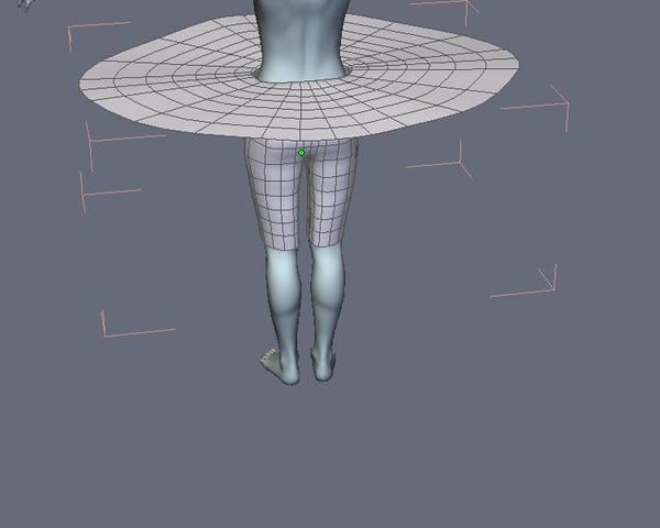 The image below shows the "cloth" grid that I am using to cage the upper thighs and the skirt (a cone with the top chopped off) has been dragged to the right to reveal the grid.