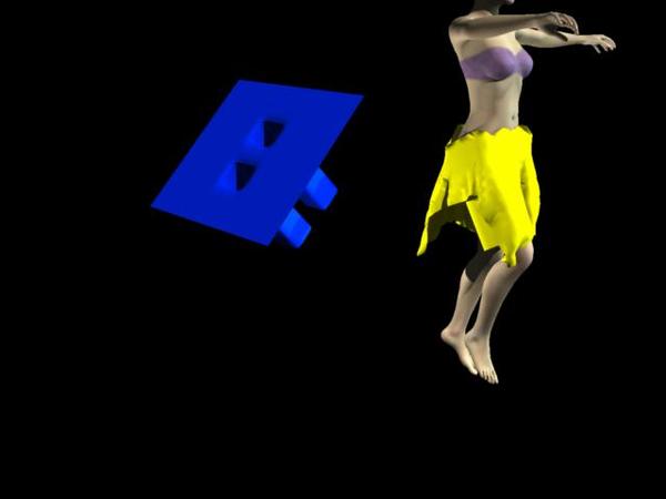 A soft body attach band around the top of the skirt and the grids on the thighs are the only forces (besides gravity and inertia) acting on the skirt. The calves can be seen going through the skirt when she turns as the shin cloth grids have been deleted for this example. With the character collision turned off the 9 second render in the video took only 4.5 minutes to simulate!