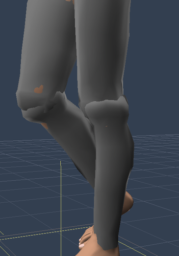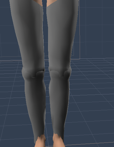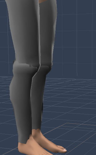 I'm trying out a new method of handling the joint at the knees, where I closed the thigh bottom and extruded a few times to make a rounded bulb from the thigh, dragged it out to the side on the x axis in the modeling room then did the same for the top of the shin, so there's essentially two ball-like ends for both the thigh and the shin that are sitting in the same space (covering the knee but attached to different rotations).