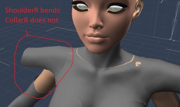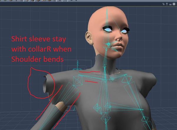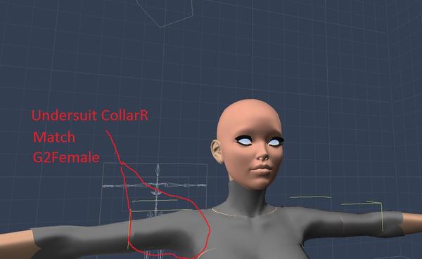 Here is the problem illustrated at the shoulder for the Genesis 2 female with custom morphs. The undersuit panels match the chest, neck, collars, and shoulders. Each panel has been soft body attached to its corresponding bodypart. When the shoulder is rotated downward but the collar untouched, the base figure's collar vertices also bend downward to some degree in the blend zone but the bone fore the collar does not move. Because the collar panel is attached to the collar bone, the collar panel does not move downward when the shoulder is rotated. Therefore, the sleeve of the shirt does not bend downward. The result is that the sleeve of the shirt also fails to drape downward and the base figure's arm pokes through the bottom of the sleeve. This is certainly not new information, but I think it is a clear demonstration of what one basic problem around the joints.