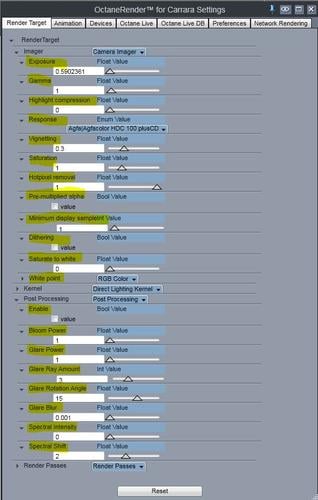 Octane doesn't give you the ability to change the individual light settings "on the fly" without restarting the render like Lux does. But there are several settings that can be changed on the fly without the render restarting. These settings include: exposure, gamma, highlight compression, (film) response, vignetting, saturation, hot pixel removal, as well as several "post processing" effects. See the attached image for the complete "list", everything under Imager and Post Processing (highlighted) can be modified on the fly without the render re-starting.