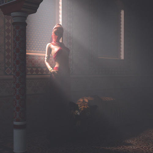 The first image (with the tiger) is actually two images. Took about 12 hours to render both. One render was with the fog box, the other was without. The without was layered over the fog image, with an opacity of 10%. No other post rendering was done.