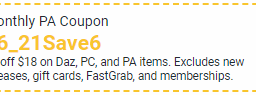 "$6 off $18 on Daz, PC, and PA items. Excludes new releases, gift cards, FastGrab, and memberships."