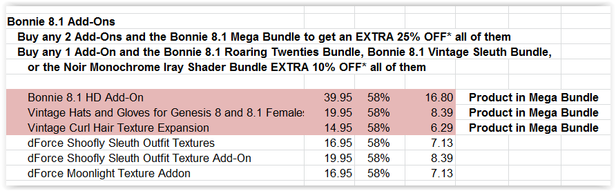Richard said the Addons should be a link and it is fixed, but I've tried refreshing the page and it still isn't a link or me. The only things showing below the addons heading are the Noir textures that are in the mega bundle already. I tried adding them to my cart to see what would happen. Adding one set of tetxtures took the price down by about $6 but adding two put it up by about $7. This doesn't make any sense at all, one item shouldn't trigger any reduction according to the stated rules. Just to make sure I tried using another computer that I don't think has ever viewed the Daz store and it still wasn't a link and still only showed the Noir textures.
