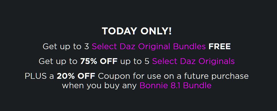 But I've just noticed that the 3 Free Daz original Bundles and 75% off 5 Daz original offers are for today only. So I'll just forget about the whole thing (apart from getting about $6 off by pointlessly buying a set of shaders twice) and buy the offers that do work.