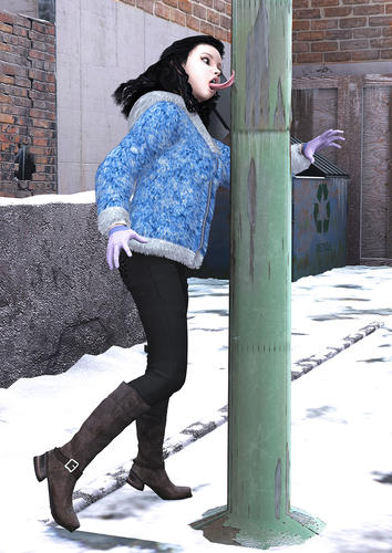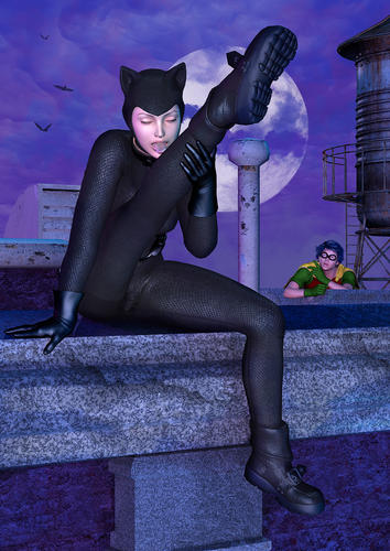 At last, a chance to use Joe Quick's wonderful free Catwoman outfit from ShareCG (re-textured with Leatherize and DLD Leather shaders.) I actually used Tongue Control to get the expression on Robin's face as well. He was going to have his tongue hanging out, but it turned out that the drop-jawed gaping mouth was even funnier.