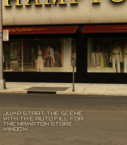 For anyone who need a one click solution for a quick background there is a fill for the Hampton store front. This also means there is a prop that you can project any image on in the diffuse channel to create your own custom store front. Use an under sea image or a existing storefront picture.