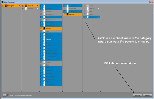 Go to the Smart Content tab. Then select the People category. Click on the items you want to move to the Figures/People and then right click. In the menu that pops up, select Categorize.... Then follow the highlighted category tree (Default/People...) until you find the lowest level that has the check box checked. Uncheck it. Then go back to the top of the category tree and select Default then Figures then People. Then put a check mark on People or keep going to a lower level, like Feminine, Masculine. etc. When you are done, click Accept.