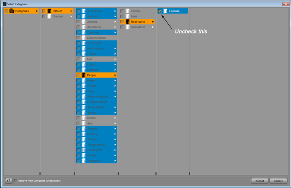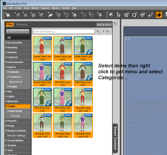 On my screen I have 2 categories for people figures in the smart content browser; people and figures. Figures contains the sub category of people which has subs for male, female etc. The main category of people only contains 2 daz kids and nothing else. When i want Figures>People you know what I'm instinctively hitting first, right? people, not figures. I want to get rid of the People category with the cartoon kids or put all of the daz people in the People category. Help?