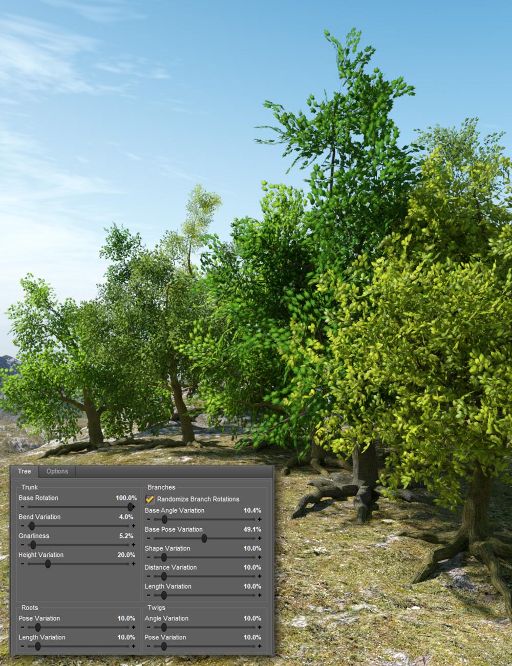 This first pack of the series contains a general, classic tree type, but this tree can have countless different shapes! You can pose it manually, of course, but the real power of this set lies in the included Randomizer script. Use the script to create an infinite number of different trees. Low randomizing values in the script will create similarly, but still different trees; perfect for a tree-lined avenue. High randomizing values will create completely different trees that are perfect for woods and forests. Save out presets to create the same tree style for all resolution levels.