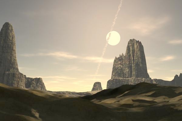 I used Holly Wetcircuit's photoreal sun tutorial from the Carrara Cafe and decided to try an alien landscape. I also made a torus and replicated asteroids on it, but I think I need to use even more artistic license and make it more prominent. This was just a quickie and I already have an idea for a more detailed take on this scene.