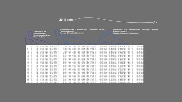 what i call a server is simply a SDK 2.0 based program that initializes the kinect and "prints" out poses to the stdout/console 30 times per second