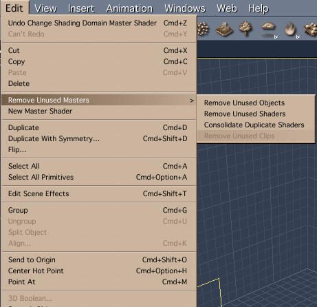 Another thing that can help is a little scene housekeeping. Sometimes in the course of building a scene, you may try different objects or shaders and decide you don't want them, and delete the object or replace the shader. They're still there, contained in the scene file. Tp purge the unused items, go to Edit--> Remove Unused Masters. Under that is the option to remove unused objects and shaders, and to consolidate duplicate shaders.