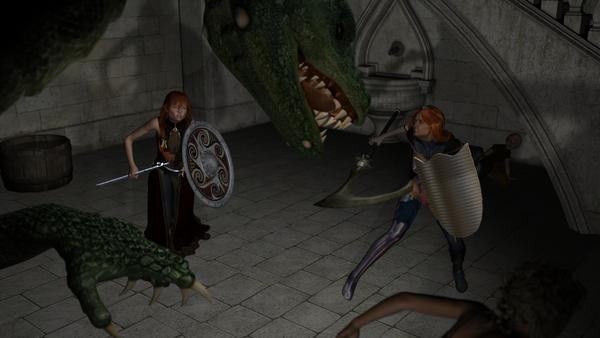 To further improve the image I'd think about how the scene is lit (torches? sun/moonlight coming through a window? dragon fire or magical sources?) and adjust the lights' colors, positions, and intensities accordingly. As Dollygirl said, color can help to draw the viewer's attention to the characters, and possibly add more drama and suspense, too.