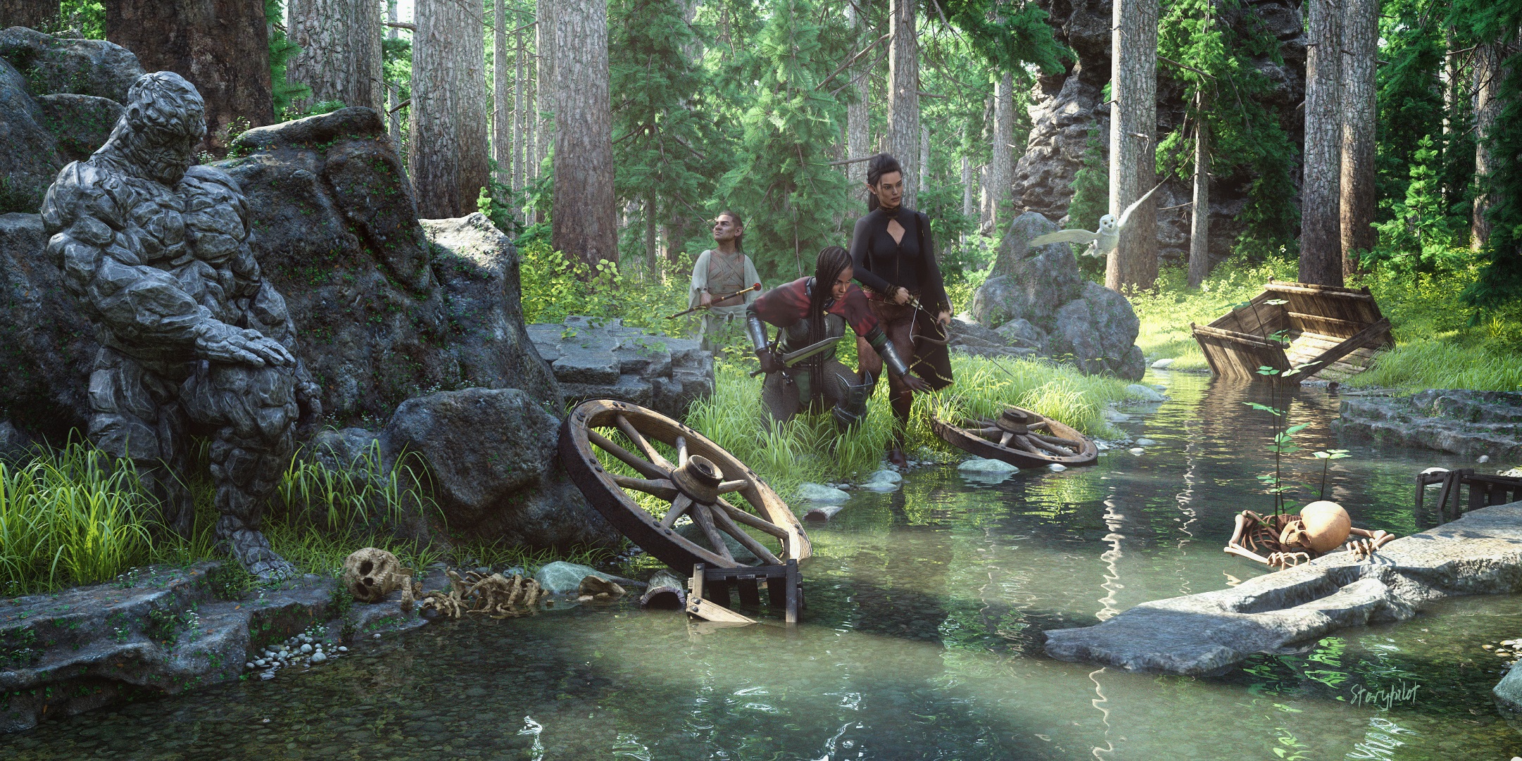 You're welcome! Wi th my renders, I had literally included a sword somewhere and a magical element, literally sticking with the theme. Your render broadened the scope more and really has a strong "Going on a quesf" vibe to it and J just about all goo d fantasy stories are based on some kind of quest, so it fits very well. Then wa s your level of details. Very impressive. I