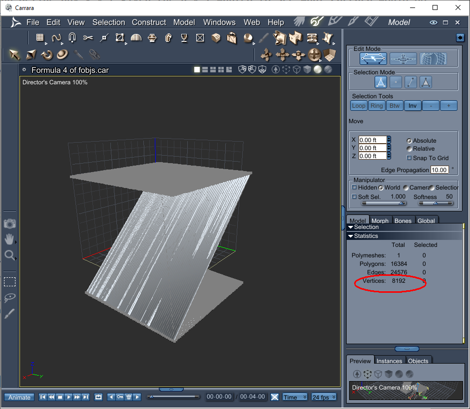 The result is expected, we have now two planes of 4096 vertices. Notice both planes are joined which means Carrara always trys to join subsequent vertices.