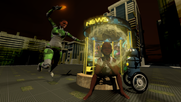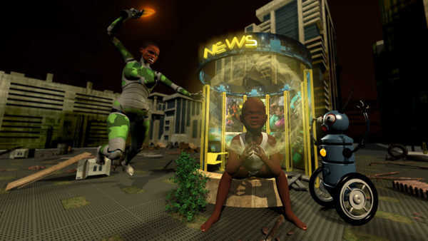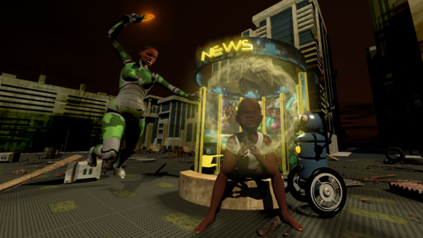 Have I mentioned how addicted I am to the emit effect for objects now. I've used it in three places, the text (news), the energy shield sphere and the staff being wielded by the bot genesis warrior. I tried to add some glow to the Dystopia city blocks' windows to simulate night lighting, but it wasn't working well for me, so I took it out. For the environment, I added a realistic sky with a night time setting, which I found just fine.