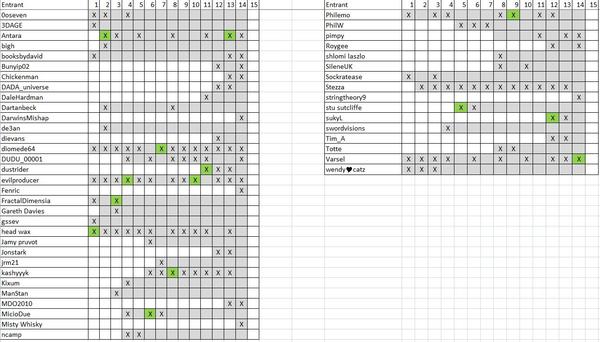 Just thinking about the voting method in relation to the small number of entries so far. If there is only one or two more entries, then there is a strong probability that more than one entry will get unanimous support if the voting rule from the last challenge is used for this challenge. Might want to be thinking about tie breakers, or a different voting rule than the last challenge, or...