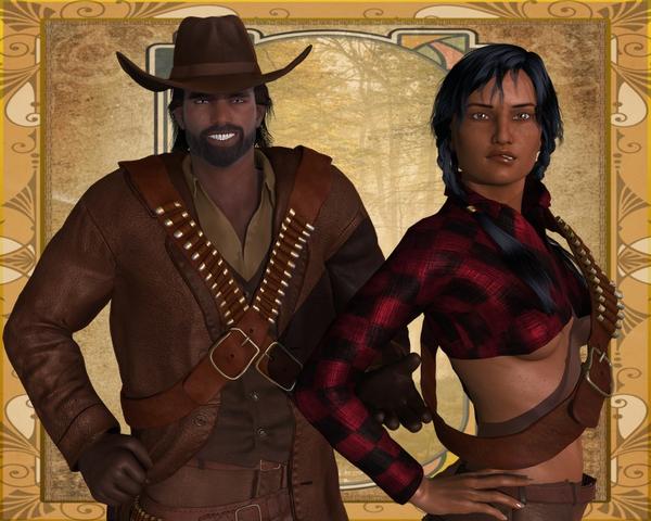 Here's a pic with the shirt without the vest and coat - I did no postwork on this and I am not sure whether the gun belts can be adjusted to fit more snugly without the coat but will check into it. You might be able to see that the collar is sticking up a bit with this pose for her, I doubt it would be very noticable if she had on the coat and vest. (I put a shader on the shirt.) I notice the bullets do that warping thing that happens with models sometimes but I am not sure that can be remedied either. Wasn't sure whether you meant a Native American partner for her, but here is GypsyAngel's Apollo (M6), he makes a pretty nice cowboy. :) Also, I haven't tried this yet to see if it can be worked into a scene where the person is riding a horse or sitting - don't know how that will go with that coat. -Cathy