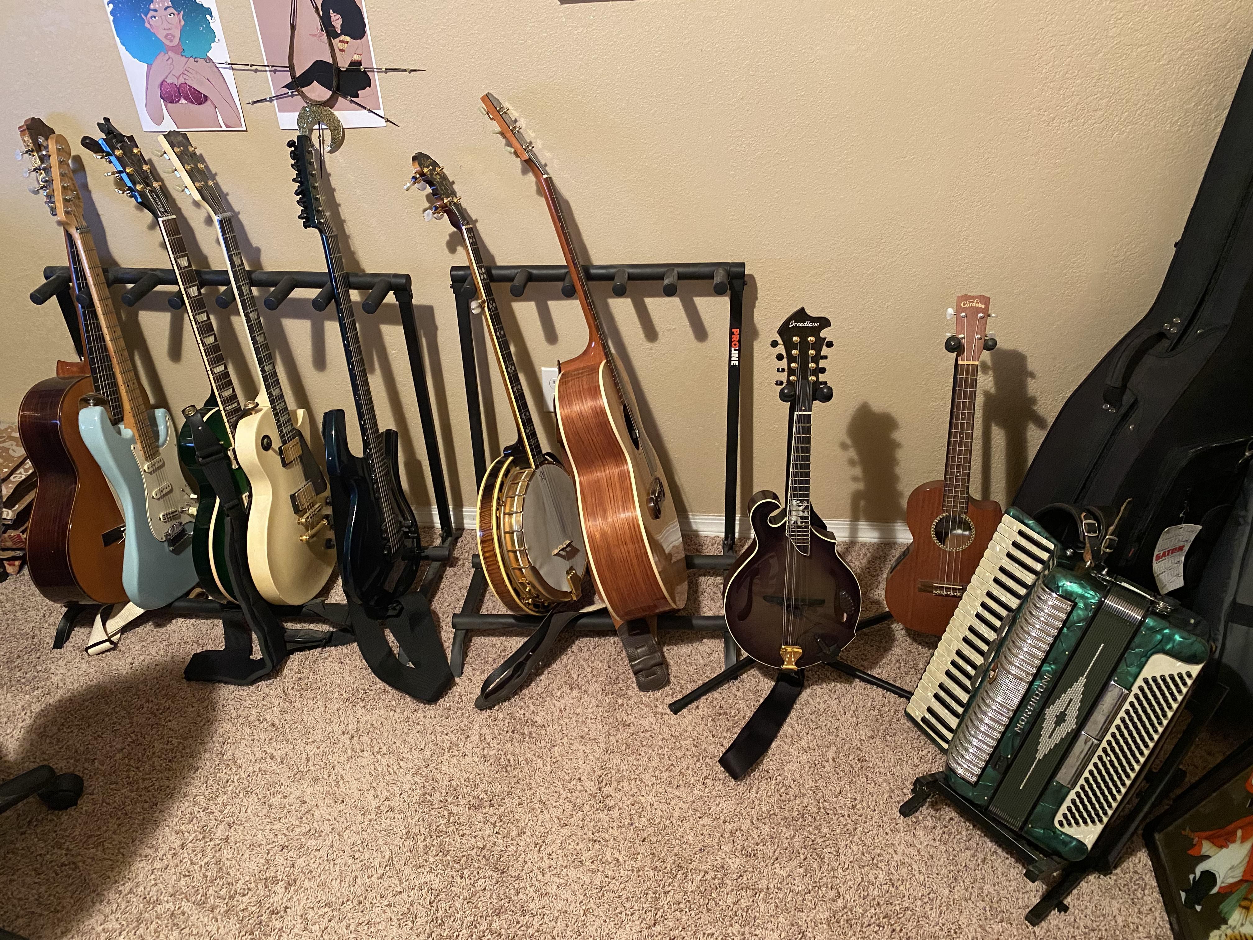 Nice job on the video.  For acoustic, I have a Guild F48.  Bought it new in the mid-to-late '70s at Wurlitzer's in Boston.  Started on drums in the late '60s, then moved to bass  in '69.  Later, picked up some six strings...Gibson SG Custom ('65 to '69...Gibson isn't more exact than that), later a G&L Legacy Special in the late '90s.  Have some keys as well, and a flute (solid silver Gemeinhardt - may not have spelled that right), a few mics (two Beyer Dynamics M500s, one Senheiser), amps, few pedals, Roland Space Echo, LP double strung chimes, etc.  Haven't really played much of anything in several years, though.  Trying to get back to it...life keeps happening.