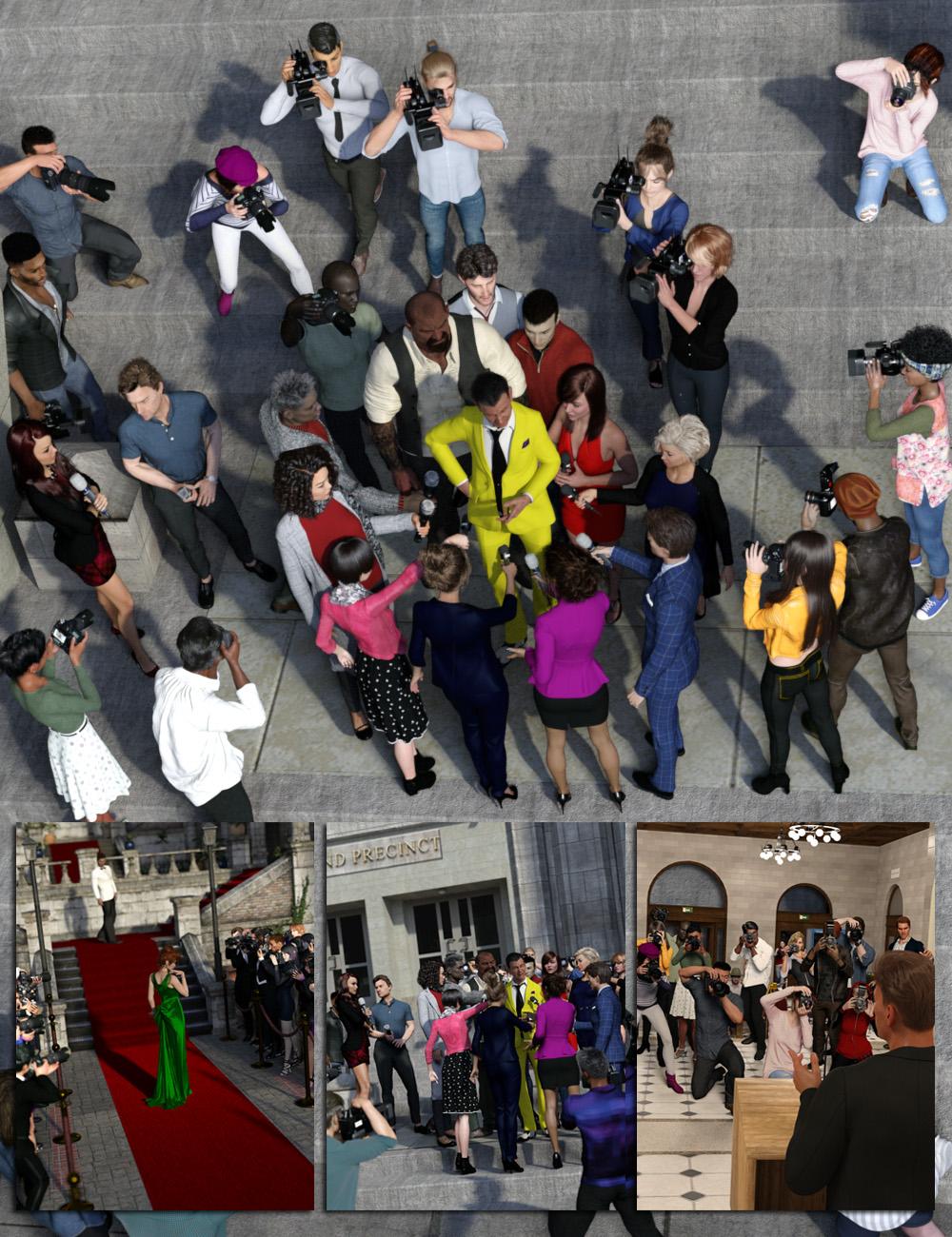 The paparazzi have descended on your Daz Studio scenes and are ready to follow your characters into any location! Paint your disasters, celebrity events, fashion shows, and other newsworthy scenes FULL of reporters, cameramen and women, and photographers in high quality, flexible, and easy-to-use billboards. The Now-Crowd Billboards - Paparazzi Bundle is perfect to use as a backdrop for the main action that you add!