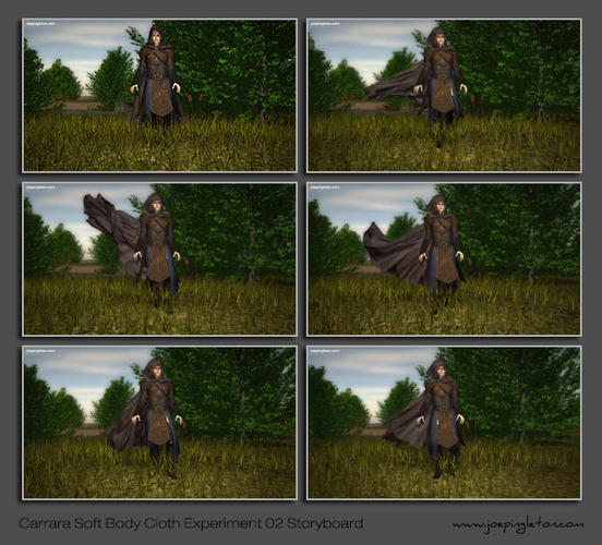 This is another experiment in getting Carrara's soft body modifier to work with DAZ clothing. I used Wildenlander HD for Genesis 2 Male cape on a walking Genesis figure. This technique is pretty limited, good for capes and such. It didn't work on dresses or full body clothing. :(