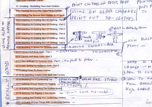 My problem and it may be only my problem, with your tutorials is remembering where I saw a particular action/ process..whatever you want to call it, in all the many lessons. There are so many lessons covering so much ground that I spend a lot of time just searching. My solution, which helps only a little, is to write on the side of the list provided by Infinite Skills, in a sketchy shorthand manner. I was wondering if anybody else had come up with a better method. Please excuse the frayed and soiled example - it has seen a lot of use.