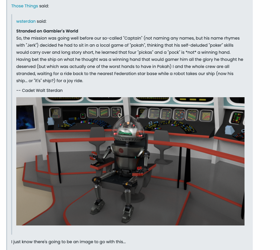 So, the mission was going well before our so-called "Captain" (not naming any names, but his name rhymes with "Jerk") decided he had to sit in an a local game of "pokah", thinking that his self-deluded "poker" skills would carry over and long story short, he learned that four "pickas" and a "pock" is *not* a winning hand. Having bet the ship on what he thought was a winning hand that would garner him all the glory he thought he deserved (but which was actually one of the worst hands to have in Pokah) I and the whole crew are all stranded, waiting for a ride back to the nearest Federation star base while a robot takes our ship (now his ship... or "it's" ship?) for a joy ride.